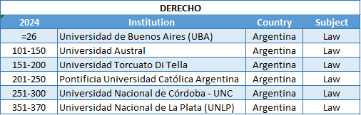 Por otro lado, la consultora internacional de educación superior QS Quacquarelli Symonds remarca que Argentina registra algunos de sus resultados individuales más significativos en Citas por artículo, que suele ser un reto para las universidades argentinas. Y destaca que la Universidad Austral registra las dos mayores mejoras del país en esta métrica, en Medicina y en Negocios y Management.Sobre esto puntualmente, el Dr. Julio Durand, a cargo de la Unidad de Reputación Institucional de la Universidad Austral, indica: “Cada disciplina científica es analizada en estos rankings con criterios que varían de un campo a otro. Ser reconocidos en ámbitos tan variados como el derecho, el management o la medicina estimula el compromiso de la Universidad Austral en su conjunto para brindar una educación de calidad”.Derecho y Medicina, dos disciplinas que continúan escalando posicionesEn 2024, y por sexto año consecutivo, la Austral se consolida como la institución de enseñanza superior de gestión privada número 1 de Argentina en Derecho y Medicina, a través de la Facultad de Derecho y la Facultad de Ciencias Biomédicas, respectivamente.Ubicada entre las mejores 101-150 del mundo en 2024, la Facultad de Derecho de la Universidad Austral es la primera Facultad de gestión privada en la disciplina Derecho, y segunda del país después de la Universidad de Buenos Aires. Y esto lo destaca su decano el Dr. Manuel García-Mansilla: “Es un orgullo para nuestra institución mantenernos por sexto año consecutivo y seguir creciendo y mejorando en el ranking QS. Los esfuerzos orientados a la gestión de la calidad académica tienen resultados concretos, como puede verse, entre otros, en el gran desempeño en los indicadores de ‘Reputación académica’ y de ‘Reputación de los Empleadores’. Esto nos deja entre las mejores 101-150 facultades de Derecho del mundo y, por tercer año consecutivo, nos posiciona mejor en los llamados tier list. Esta confirmación por parte de QS nos obliga a redoblar el compromiso de seguir por el mismo camino que venimos transitando y mantener así los niveles de excelencia que el público y nuestra trayectoria demandan”.