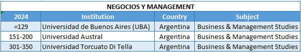 “En la última edición del QS by Subject 2024, en Business & Management Studies la Universidad Austral ha logrado ascender significativamente en el ranking: hemos pasado de ocupar el rango de 201-250 a posicionarnos en la categoría de 151-200 a nivel mundial. Esta excelente noticia refleja el arduo trabajo de todos quienes formamos parte del IAE Business School y de la Facultad de Ciencias Empresariales de la Universidad Austral. El avance refuerza nuestra posición como una de las instituciones líderes en educación empresarial en la región. Nos enorgullece saber que nuestro compromiso con la excelencia académica y la formación integral de nuestros participantes está siendo reconocido a nivel internacional”, expresa la decana del IAE Business School, Dra. Carolina Dams.Por su parte, la decana de la Facultad de Ciencias Empresariales (sede Rosario), Mag. Ana Galiano, remarca que “este nuevo reconocimiento nos impulsa a seguir fortaleciendo nuestro compromiso con cada una de las personas que pasa por nuestras aulas y con la región en la que trabajamos, procurando mantener nuestra cercanía con las necesidades del mundo empresarial, apostando por la formación integral de nuestros graduados y por la generación conjunta de proyectos disruptivos y sostenibles con una mirada de impacto global”.En línea con esta lectura, el decano de la Facultad de Ciencias Empresariales (sede Buenos Aires), Mag. Luis Dambra, agrega: “Desde nuestra Facultad, trabajamos fuertemente para que los estudiantes adquieran sólidos conocimientos técnicos pero con una visión holística que les permite abordar las problemáticas empresariales del siglo XXI en una forma innovadora, desarrollando a su vez habilidades llamadas blandas pero esenciales para la competitividad moderna, como el trabajo en equipo, resiliencia, perseverancia, capacidad de adaptación rápida a los cambios de entorno, siempre con una base ética sólida”. Los resultados completos de las clasificaciones QS se pueden ver en el siguiente link: