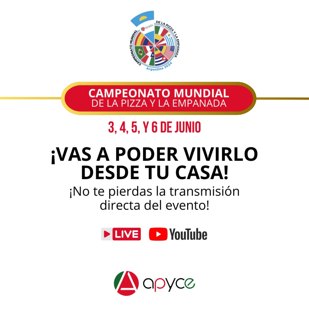 | Fecha: 3, 4, 5 y 6 de junio 2024 Evento: Campeonato Mundial de la Pizza y la EmpanadaUbicación: FITHEP Expoalimentaria Latinoamericana 2024 – Costa SalgueroOrganiza: APYCE (Asociación de Pizzerías y Casas de Empanadas de Argentina Asoc. Civíl) Miércoles 5: se anuncia al «Campeón Mundial de la Pizza«Jueves 6. :se anuncia al «Campeonato Mundial de la Empanada« |